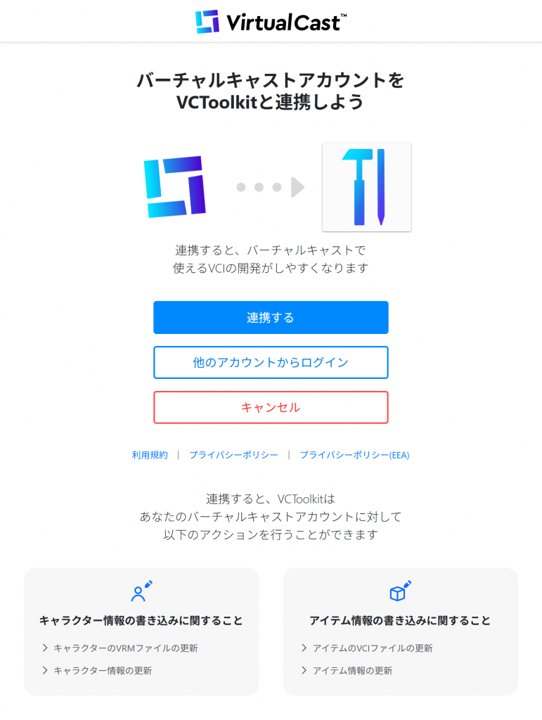 2025.10.16 [10/16更新] バーチャルキャスト アップデート内容 現在確認されている不具合と対応状況は不具合対応状況をご確認ください。 今回のアップデートではバージョンの変更はありませんが、Web上の更新がありましたのでアップデート内容を記載いたします。 WEB 機能改善 サービス連携時の確認画面デザインを、分かりやすいデザインに変更しました。 以下は VirtualCast ToolKit と連携する場合の画面表示の例です。 Category リリース情報 Tag