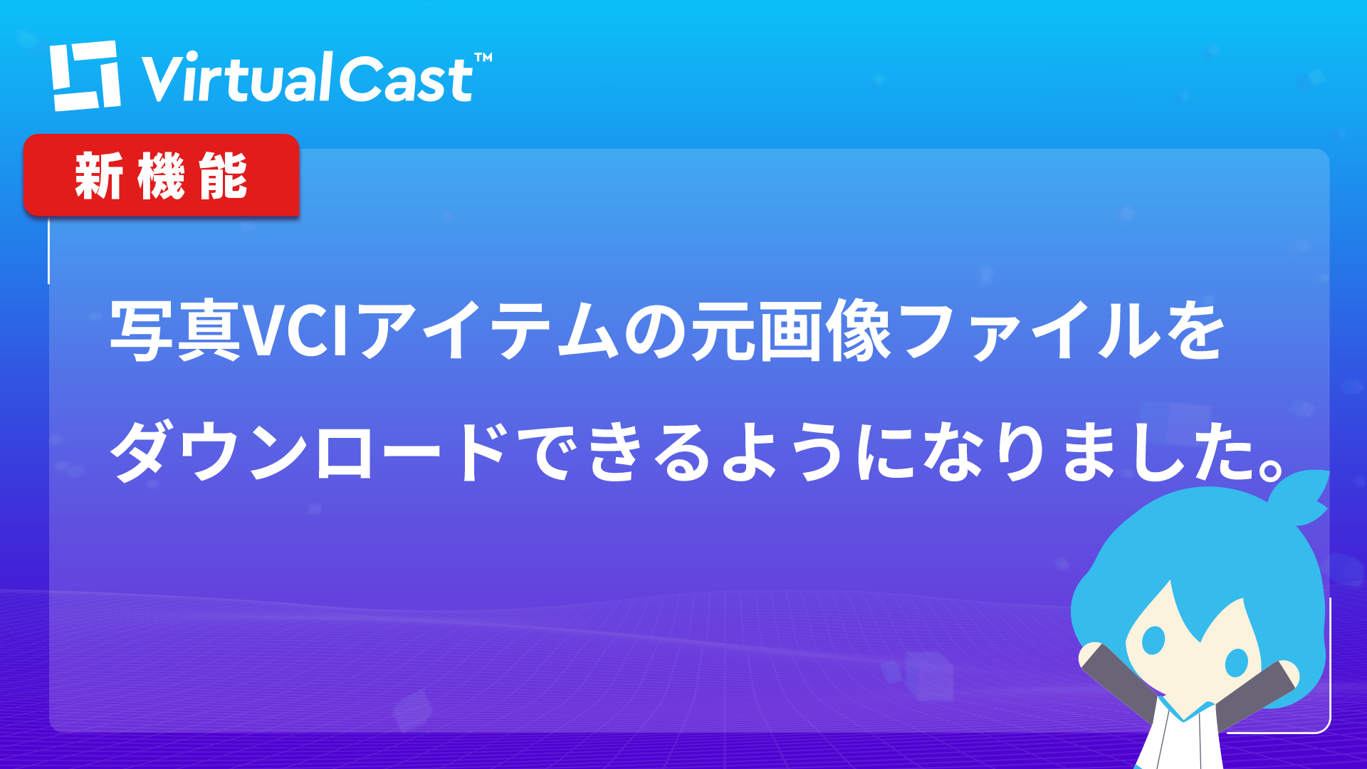 2025.10.30 [10/16更新] バーチャルキャスト アップデート内容 現在確認されている不具合と対応状況は不具合対応状況をご確認ください。 今回のアップデートではバージョンの変更はありませんが、Web上の更新がありましたのでアップデート内容を記載いたします。 WEB 新機能 フォトキャプチャーカメラで撮影した画像をアイテム化した際、元の画像ファイルを投稿アセットのアイテム詳細ページからダウンロードできるようになりました。 詳しくはこちらをご覧ください。 Category リリース情報 Tag